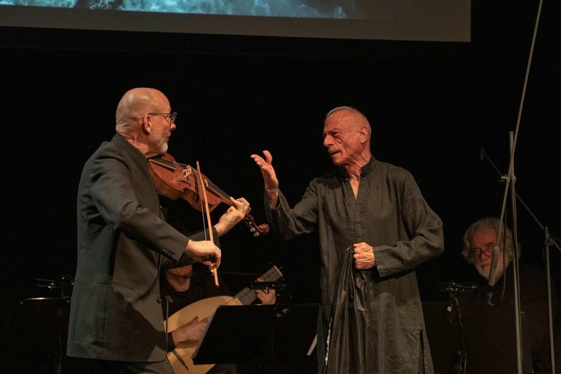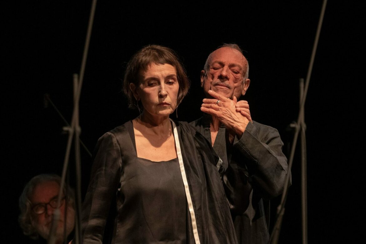 L’incarnation de Pino de Vittorio en Thésée et de Katarina Livljanić en Ariane est d’une grande intensité, d’autant que le premier souffrait d’un problème de voix qui la rendait rauque, voire âpre. Paradoxalement, cette fragilité a renforcé la tension dramatique, comme si cette voix difficilement projetée exprimait à la fois la blessure d’Ariane et l’acte incompréhensible de son amant. Les deux chanteurs-danseurs-acteurs évoluent souvent en rotation : le moindre déplacement devient chorégraphie, les gestes évoquant, par touches, une esthétique baroque, accompagnés de regards et de mouvements du corps fortement théâtralisés. Les instrumentistes, notamment Albrecht Maurer (viola da braccio), s’intègrent parfois à leurs évolutions. Ces interventions peuvent se lire comme un symbole psychologique : besoin d’appui dans la détresse ou l’interrogation, ou encore accompagnement libérateur.