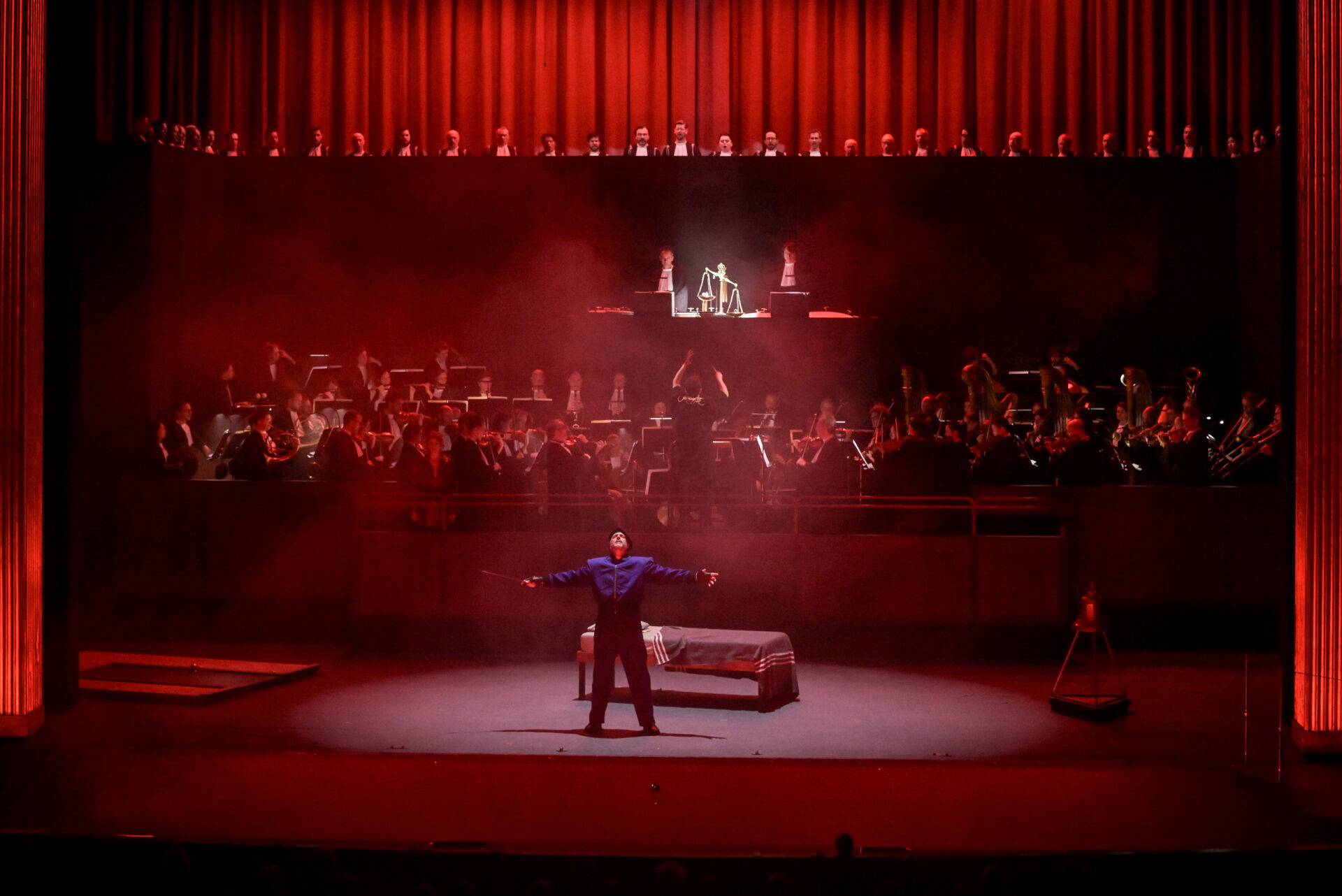 Les dernières scènes, en particulier, représentent une cour de justice où Faust est jugé avant d’être précipité en enfer. La symétrie de la tribune où siège en hauteur le chœur, vêtu de robes d’avocat, frappe immédiatement. Costa fait également de l’orchestre l’un des éléments de ces tableaux, en le plaçant sur scène, sur un plateau surélevé, tout au long de la seconde partie. Le spectaculaire est bien présent, et encore fallait-il oser cette idée. Dans la brochure-programme, elle parle d’« événement musical » plutôt que de spectacle. Sa démarche est donc conceptuelle, et il ne faudrait pas l’appréhender comme une mise en scène traditionnelle. Toutefois, peut-être le concept n’est-il pas assez affirmé pour que le public abandonne ses attentes habituelles…