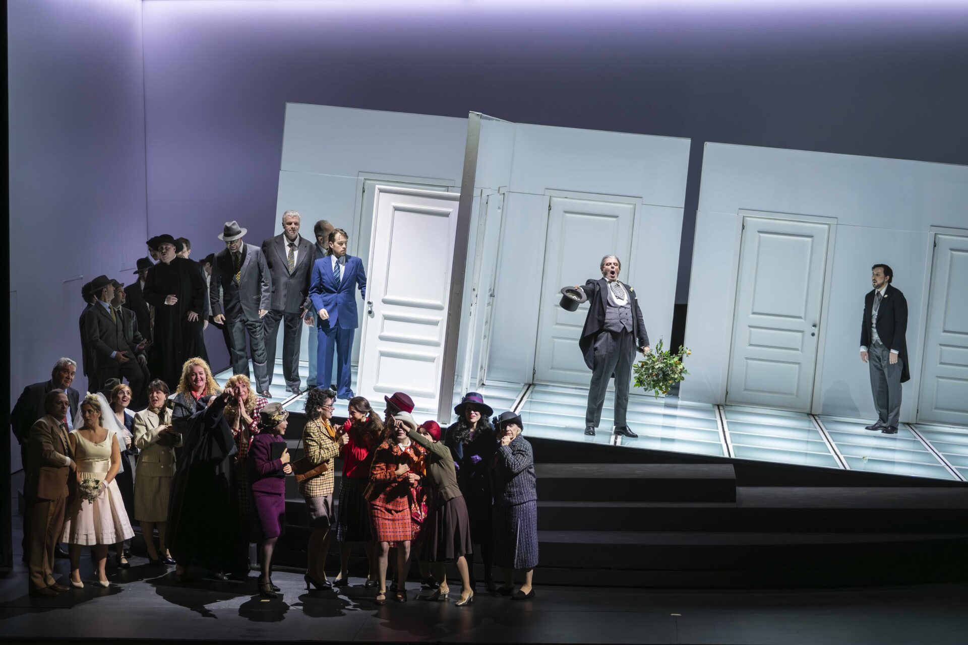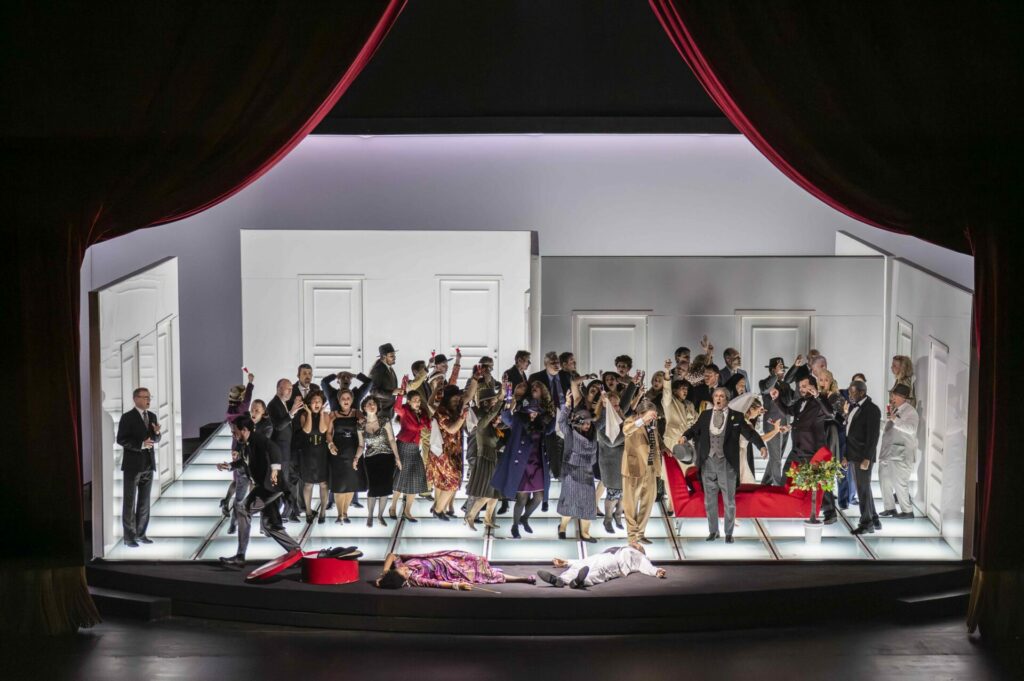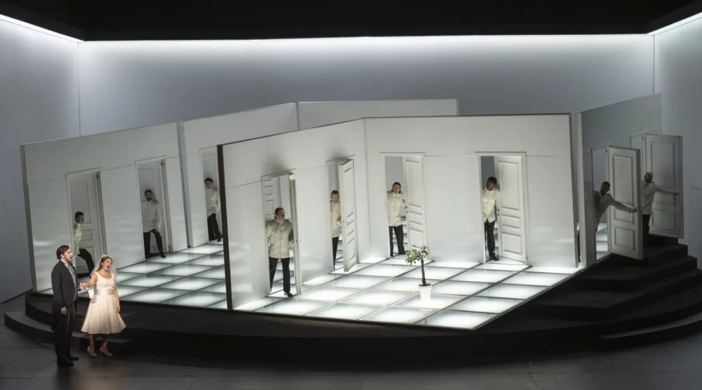 En parfaite adéquation avec la partition, la mise en scène de Damiano Michieletto impressionne par son énergie constante, sans jamais nuire à l’intelligibilité du propos, même dans les moments les plus effrénés. La scénographie de Paolo Fantin, faite d’éléments mobiles et de portes qui révèlent ou dissimulent les personnages, alliée aux lumières de Luciano Novelli, permet une direction d’acteurs d’une précision remarquable. Aucun temps mort : tout repose sur un sens aigu du timing, réglé comme un ballet.