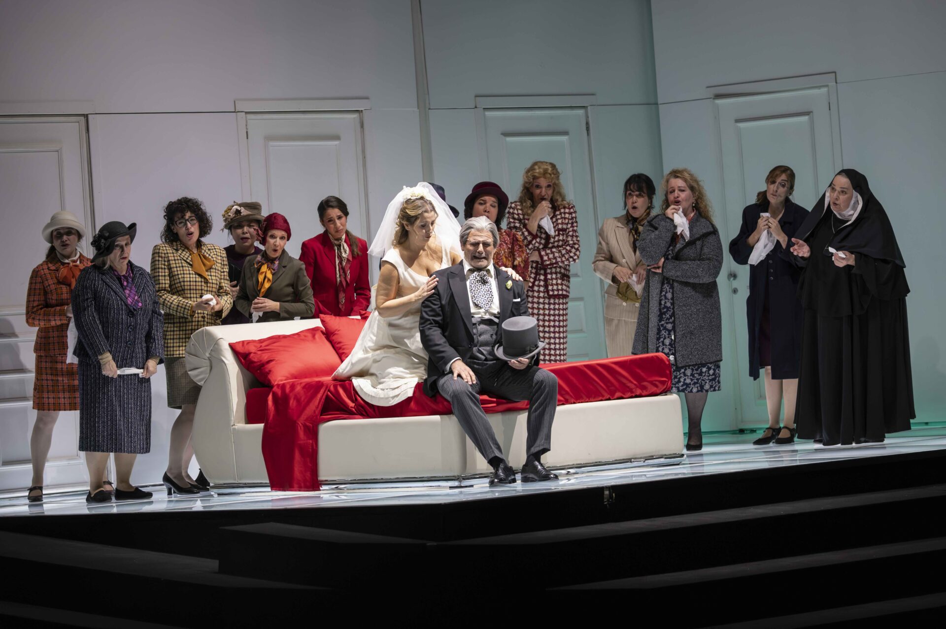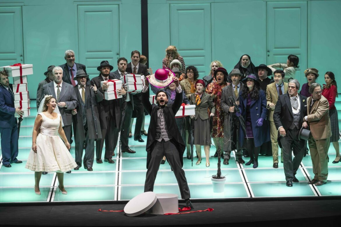 À la tête de l’orchestre de l’Opéra royal de Wallonie-Liège, Leonardo Sini dirige avec une maîtrise indéniable. Sous sa baguette, la mécanique comique fonctionne à merveille, chaque détail de la partition restant parfaitement lisible, dans une approche qui privilégie l’unité musicale à l’élan théâtral. Le chœur participe pleinement à cette dynamique, notamment dans la scène des modistes, dont la mélodie foisonnante, déjà entendue dans l’ouverture, s’inscrit comme l’un des fils conducteurs de l’œuvre.