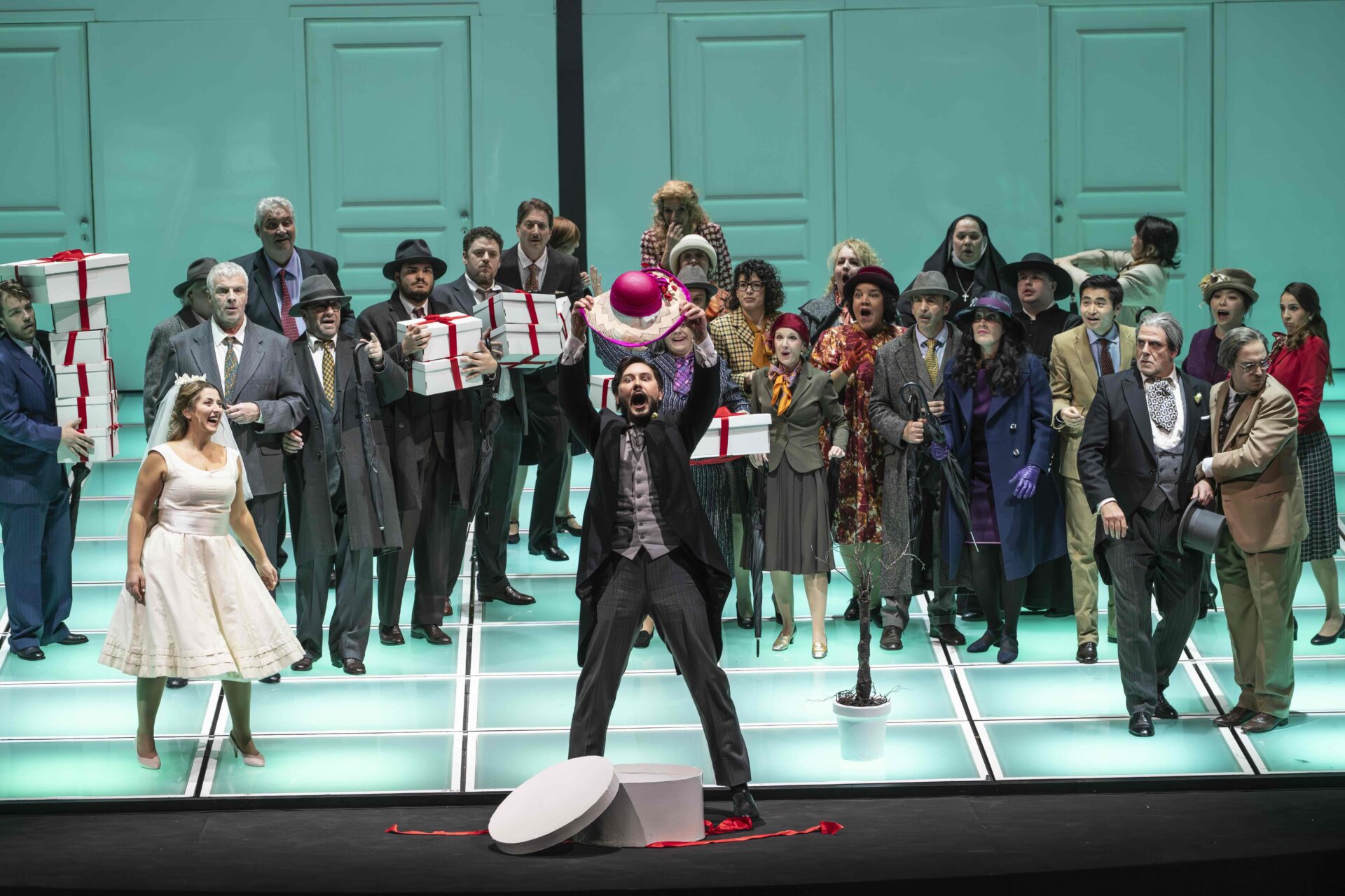 La distribution, très homogène, réunit des chanteurs parfaitement à l’aise dans le jeu comique, condition indispensable à la réussite de l’ouvrage. La vitalité de Ruzil Gatin en Fadinard est communicative. Ce ténor lyrique à la voix solaire brille notamment dans son air destiné à séduire la baronne de Champigny afin d’obtenir le chapeau : une parodie savoureuse du grand opéra verdien ou puccinien. Maria Grazia Schiavo incarne Elena, la future épouse, avec une voix claire et rayonnante. Elena Galitskaya campe une Anaïde à la fois nerveuse et coquette, fausse ingénue aux couleurs vocales changeantes. Le timbre sensuel et dense de Josy Santos sied idéalement à la Baronne de Champigny, fière et sûre d’elle dans la mondanité.