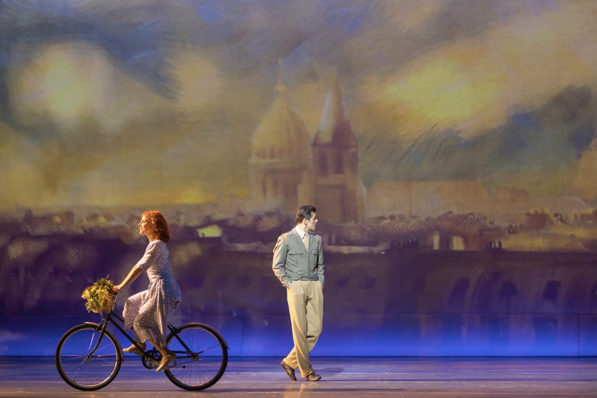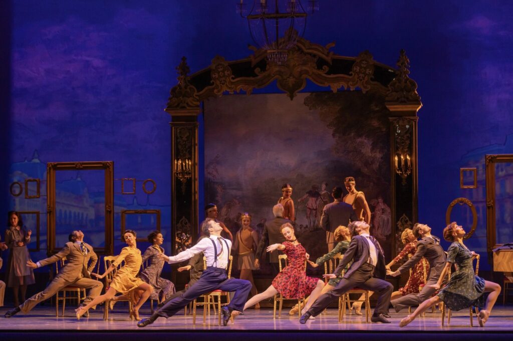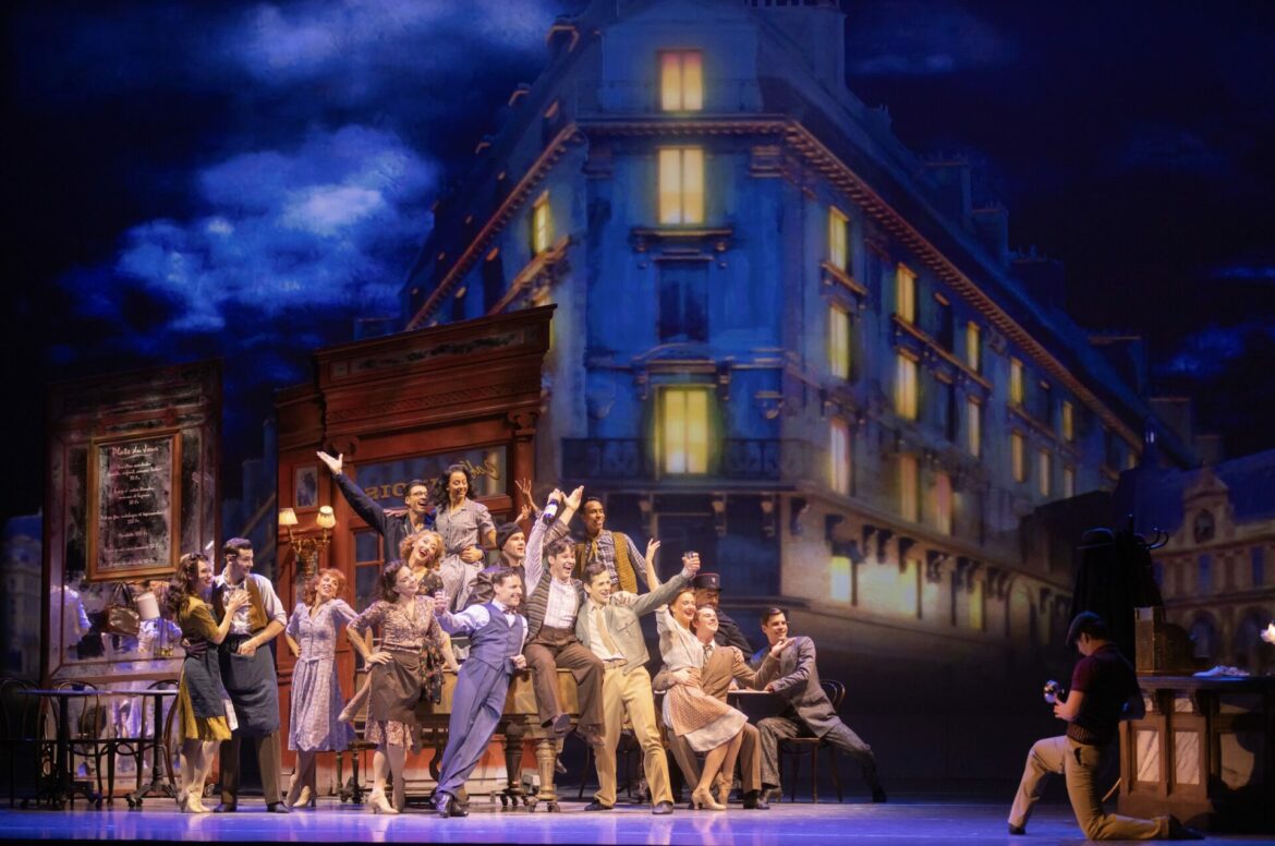 Dès le premier tableau, la fluidité des changements de décor impressionne. Signés par Bob Crowley, également créateur des costumes, ils s’intègrent pleinement à la chorégraphie, au point de constituer une danse parallèle : celle des accessoires eux-mêmes. Les miroirs, de tailles variées, alignés ou retournés, créent avec ingéniosité des effets de profondeur ou se transforment en cloisons mobiles selon les situations. Les vidéos du 59 Studio apportent à chaque scène une dimension tantôt monumentale — l’Arc de Triomphe tricolore, les immeubles haussmanniens —, tantôt délicatement poétique, comme ce quai parisien vu en plongée, où la Seine ondule doucement, ou ces fenêtres illuminées dans la nuit. L’alliance de ces éléments scéniques est magnifiée par les lumières de Natasha Katz, changeantes sans jamais fatiguer le regard. D’un salon bourgeois à un atelier d’artiste, d’un rayon des Galeries Lafayette à la scène du Châtelet, ces métamorphoses à vue constituent un spectacle à part entière.