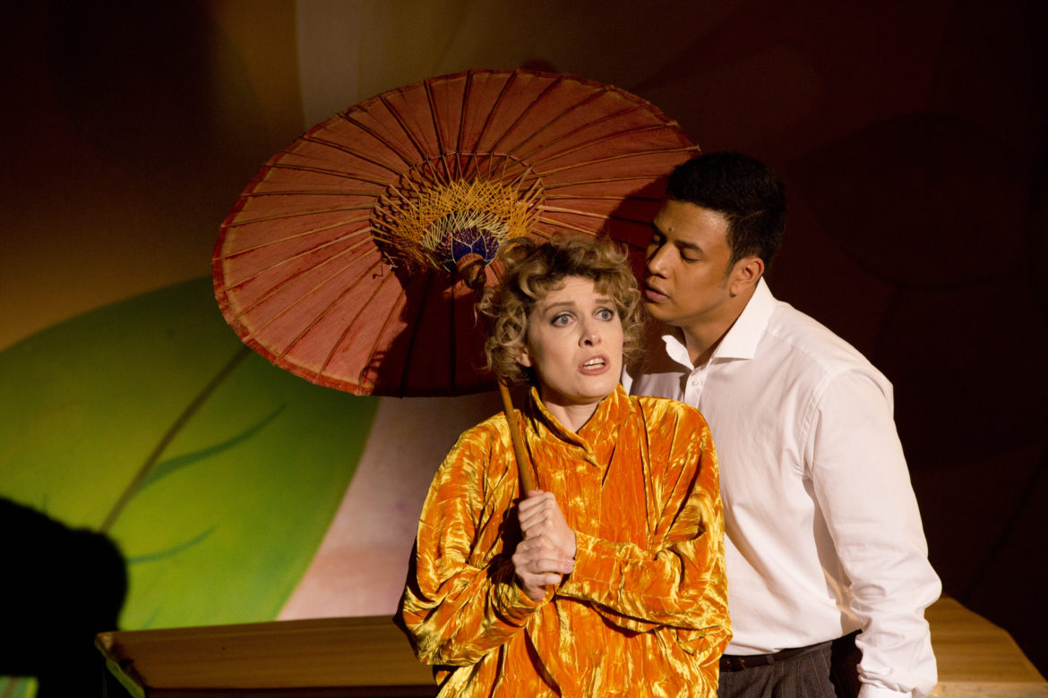演出はコメディ・フランセーズ Comédie française のジェラルディーヌ・マルティノー Géraldine Martineau。屏風を簡単なパネルにし、コルネリスの書斎も書類や本が無造作に置かれた現代のオフィスのようだ。描かれた女性もシンプル(日本人から見ると中国風な幼稚な絵と映るかもしれない)で、正直言ってあまり冴えない。19世紀のジャポニズムの面影をどのように現代に表現するかと期待していたのだが、拍子抜けしたというのが率直な意見だ。ただ、演出家の観点からすれば当時のオリエンタルなものに対する目線を避けて、普遍的なものにしたかったのかもしれない。あえて言えば、パネルの女性に重なるようにレナが登場したあと、レナの姿をかりて絵が動き出すような演出は、単純とはいえ効果的だった。