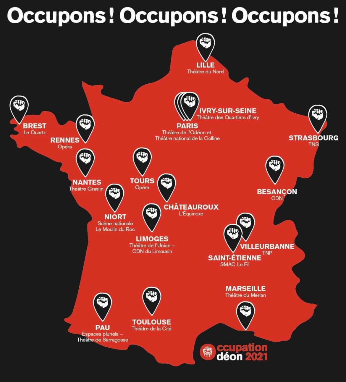 3月4日以来、文化施設再開とフリーランスアーティストの社会保障費免除期間延長を求めて、アーティスト有志がパリのオデオン劇場を占拠していますが、運動は3月10日ごろから一気に全国に拡大し、12日現在、次の劇場が加わっています。