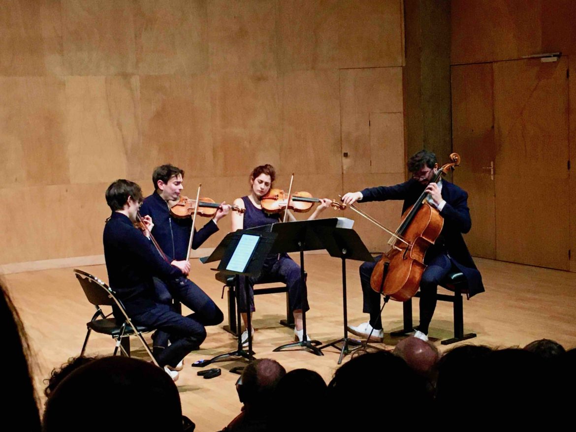 コンサートが始まって4人が出て来ただけで拍手がしばし鳴り止まず、一旦座った彼らが、再び立ってお辞儀をしたほどだ。観客の中にはパリ音楽院の同級生や、同じ世代の音楽家などが多く見受けられる。拍手と掛け声で同僚を応援しようというかのような、和気あいあいとした雰囲気の中で第1ヴァイオリンのアントン・アンソンが簡単な挨拶し、コンサートが始まった。