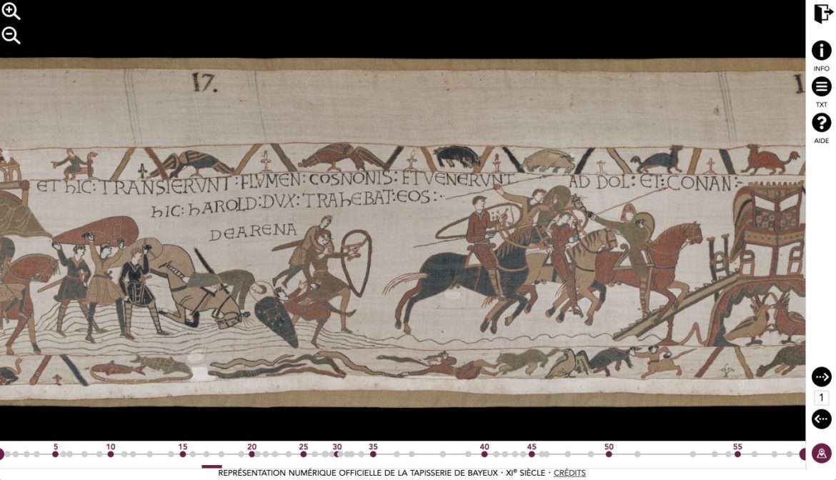 「マティルド王妃のタペストリー」とも呼ばれるこの長大な刺繍を全て詳細に閲覧できるサイトがある。バイユー博物館、ノルマンディ戦記念博物館、ジェラール男爵芸術歴史博物館からなる「3 Musées(3博物館の意)」の共同サイトが特別に開設しているもの。ここにある画像が、バイユーのタペストリーの公式デジタル画像だ。リンクはこちら。